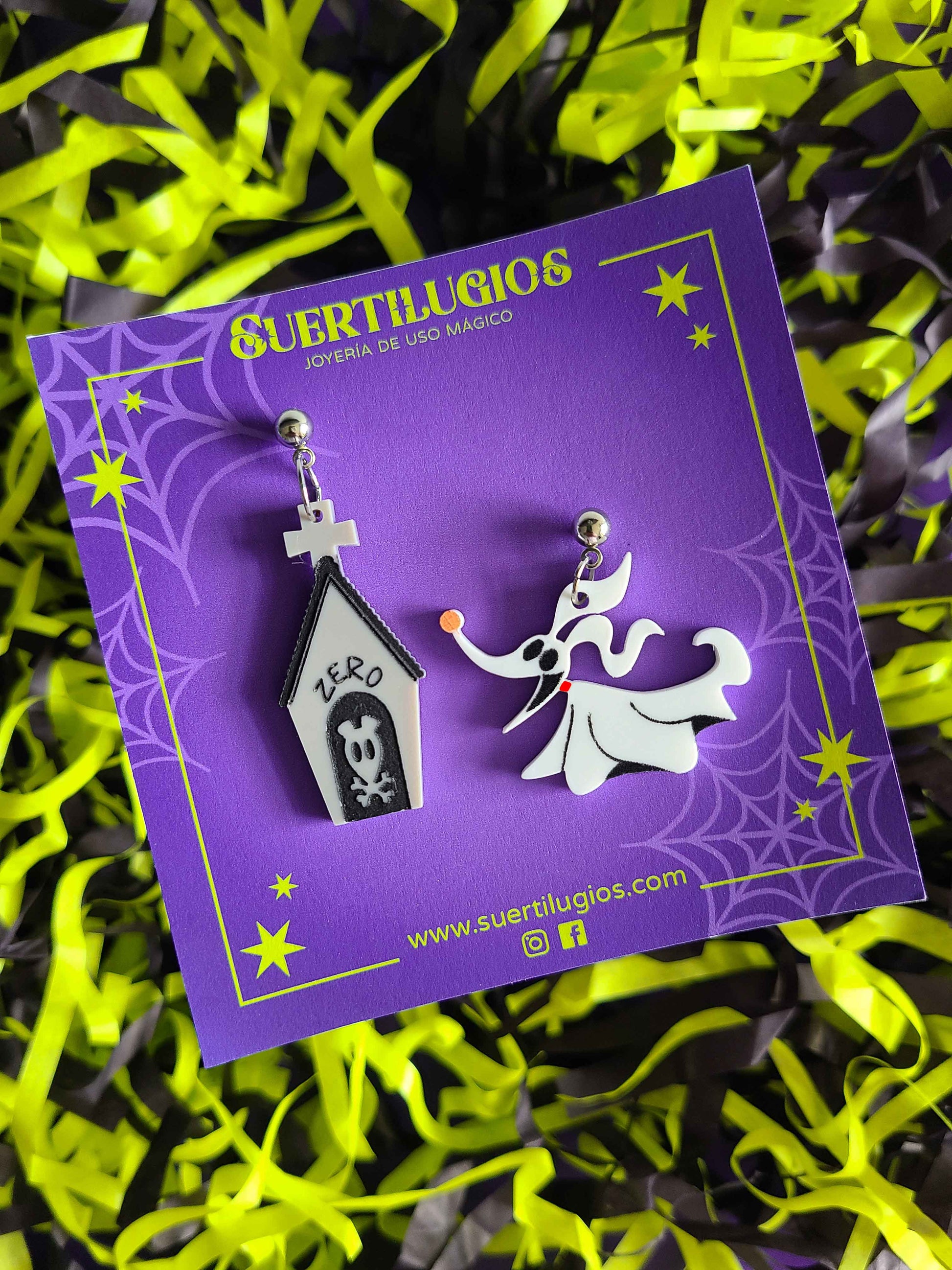 Estos aretes de Zero y su casita capturan la ternura y el espíritu travieso del perro fantasma más adorable. Fabricados en acrílico, cortados y grabados a láser con todo detalle, son ligeros y llenos de encanto para fans del mundo de Jack.